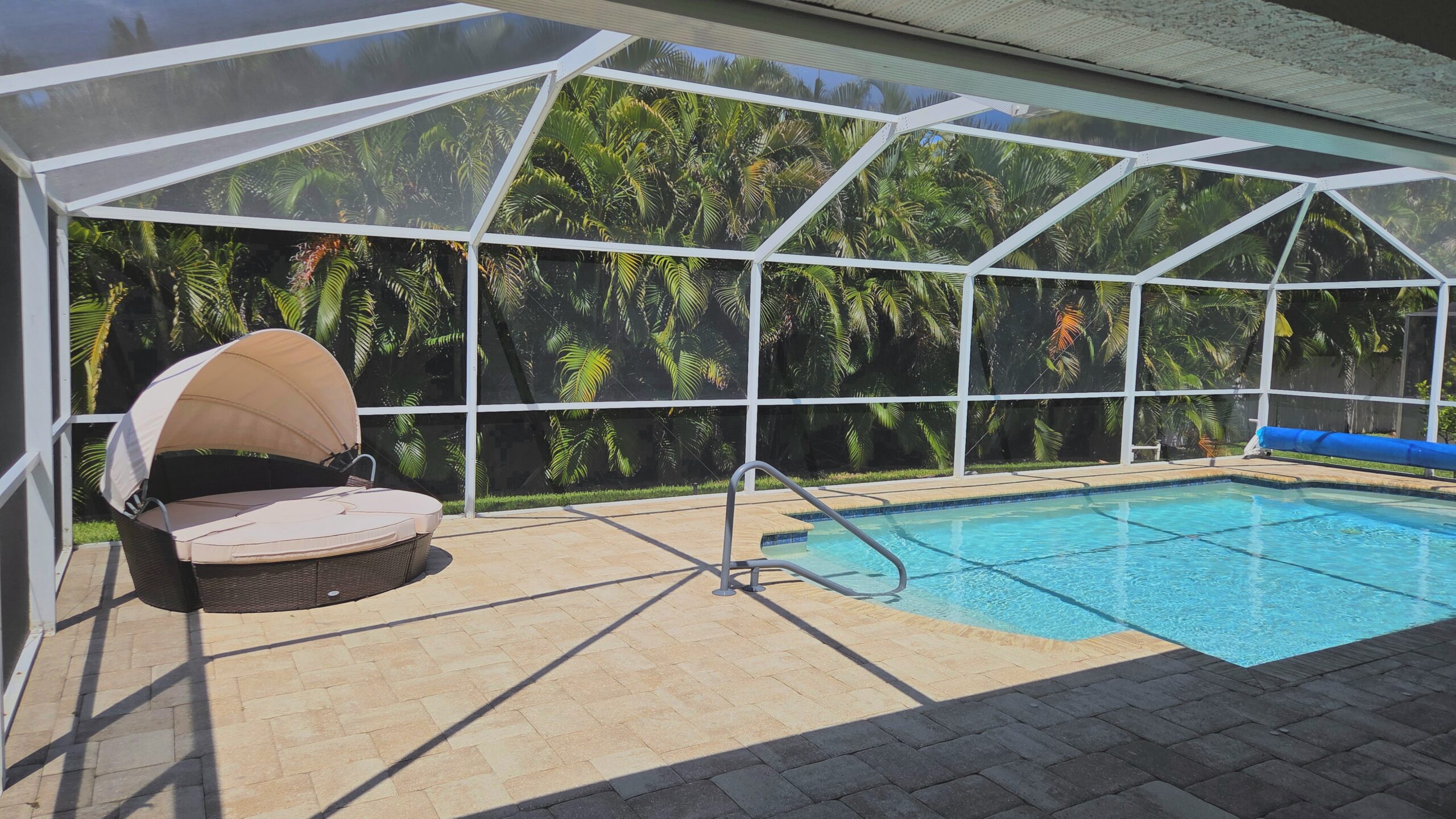 Beautiful western exposure, large 3 bedroom/2 full baths villa, with large electric heated pool & screened lanai with large sunbathing area. New handrail installed. Located in the SW Cape Coral near Camelot Plaza shops, also close to Cape Harbour and restaurants, more. Large HDTV’s with HD service in living room, and in all bedrooms, Free high speed WiFi, new large LP gas grill, lounge chairs, private large pool & lanai area for swimming and sunbathing, master suite has large study room and access to lanai, and much more!